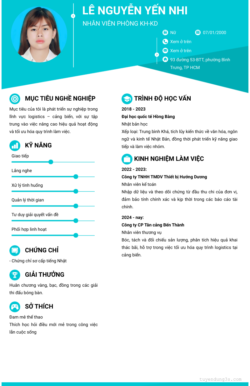 Mở xem thông tin đầy đủ ứng viên LÊ NGUYỄN YẾN NHI chỉ với 2 điểm. Ứng viên được cập nhật ngày 26/09/2025
