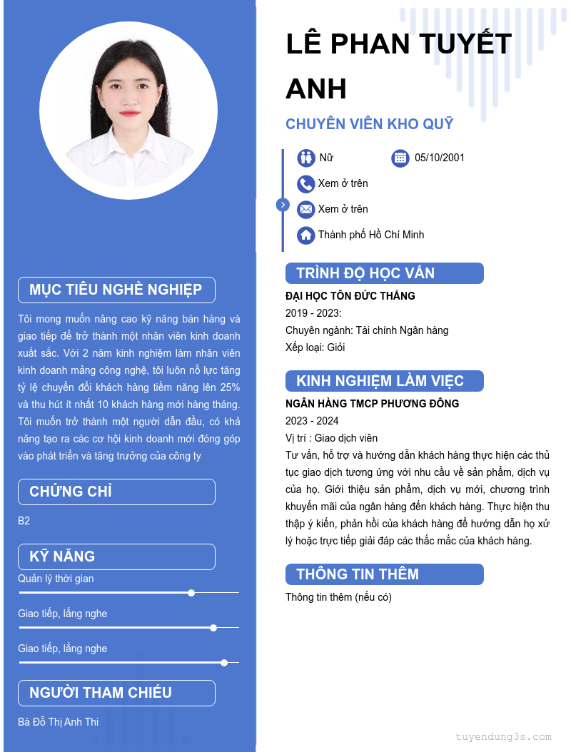 Mở xem thông tin đầy đủ ứng viên LÊ PHAN TUYẾT ANH chỉ với 2 điểm. Ứng viên được cập nhật ngày 20/05/2024