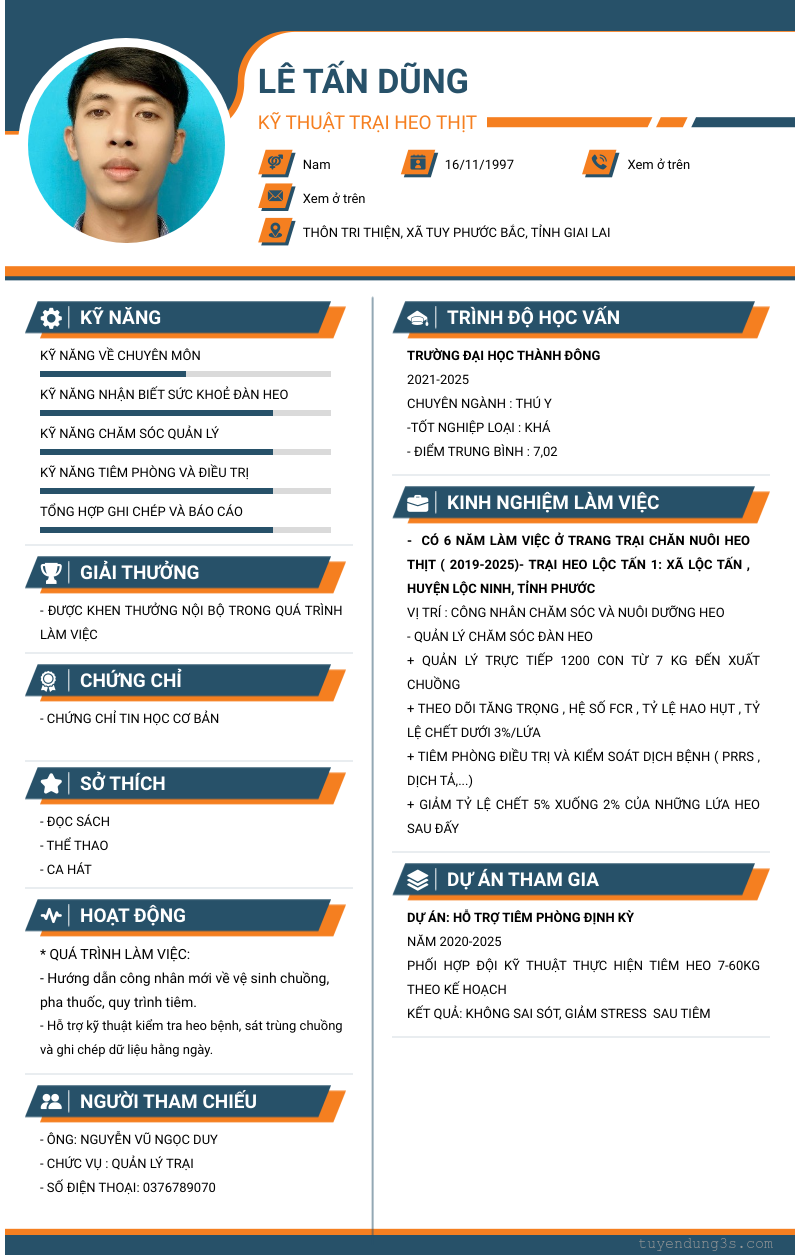 Mở xem thông tin đầy đủ ứng viên LÊ TẤN DŨNG chỉ với 2 điểm. Ứng viên được cập nhật ngày 12/11/2025