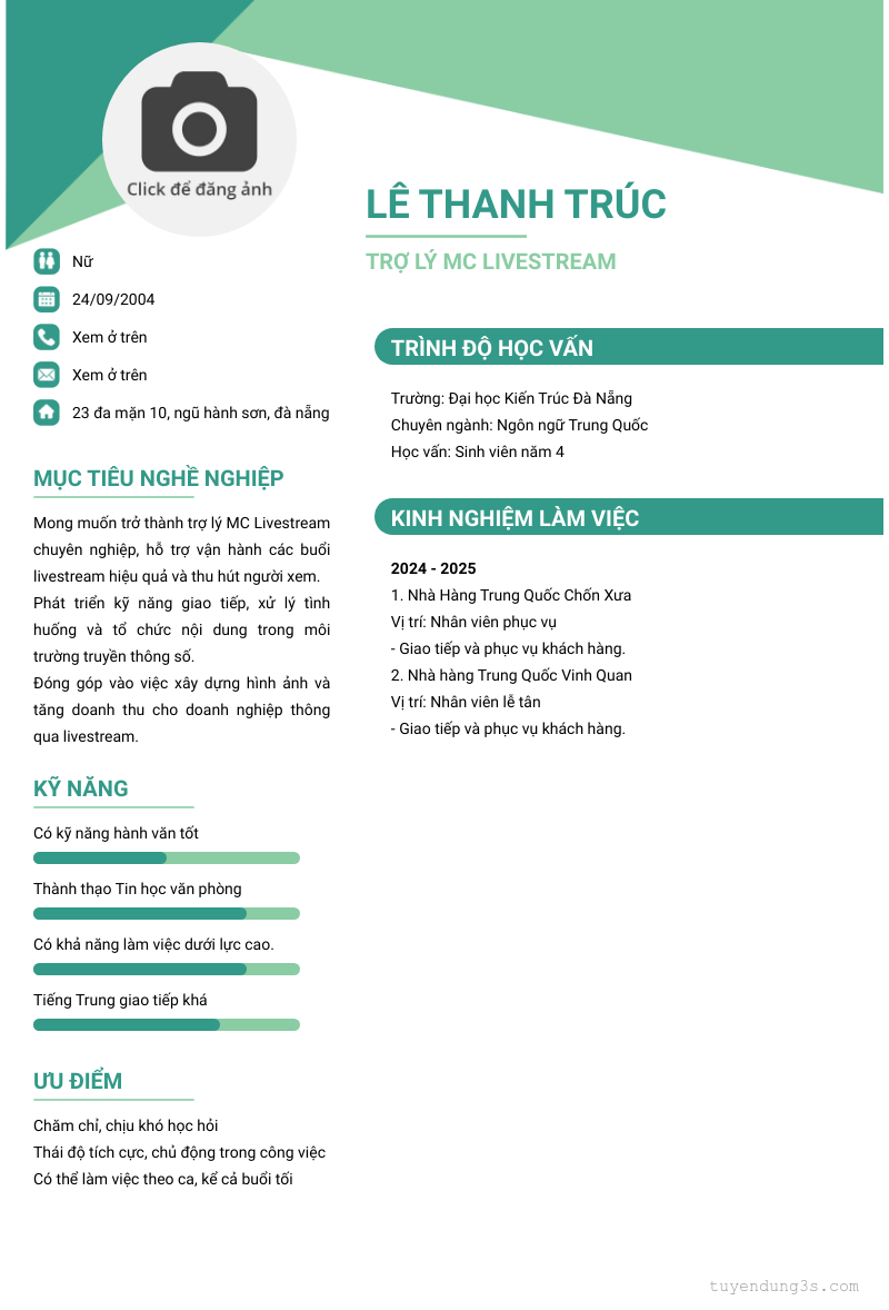 Mở xem thông tin đầy đủ ứng viên Lê Thanh Trúc chỉ với 2 điểm. Ứng viên được cập nhật ngày 31/03/2026