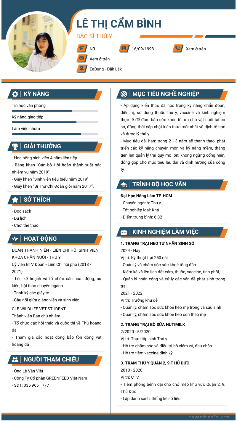 Mở xem thông tin đầy đủ ứng viên Lê Thị Cẩm Bình chỉ với 2 điểm. Ứng viên được cập nhật ngày 09/12/2025