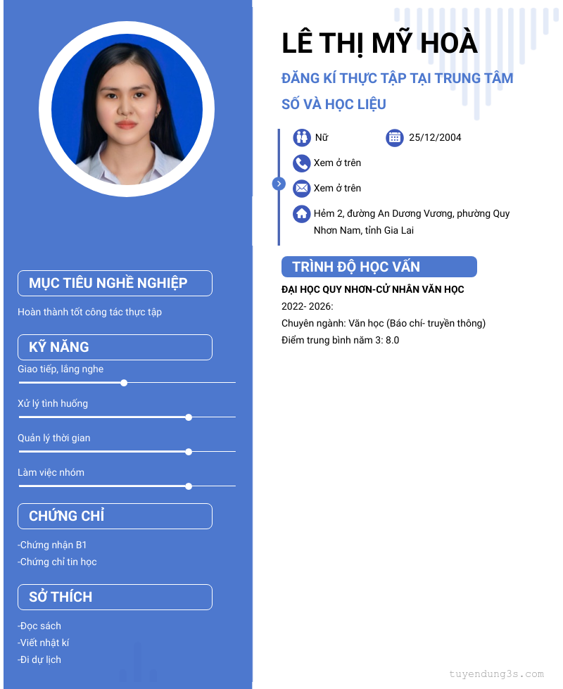 Mở xem thông tin đầy đủ ứng viên Lê Thị Mỹ Hoà chỉ với 2 điểm. Ứng viên được cập nhật ngày 06/12/2025