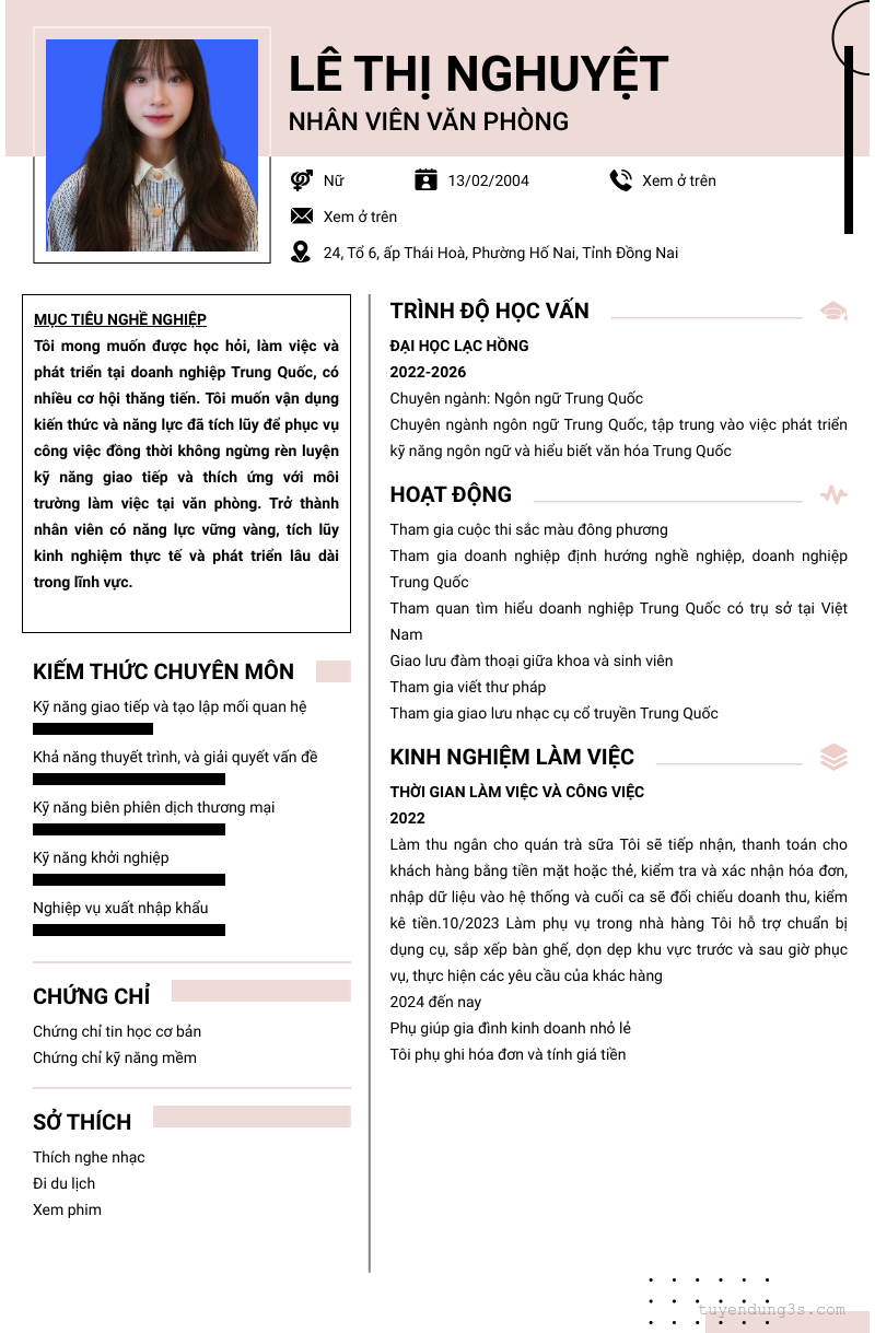 Mở xem thông tin đầy đủ ứng viên LÊ THỊ NGHUYỆT chỉ với 2 điểm. Ứng viên được cập nhật ngày 07/11/2025