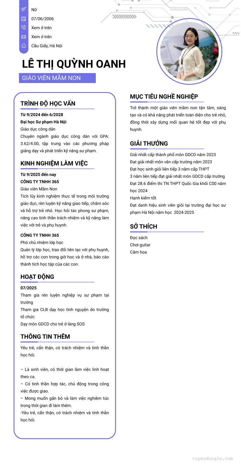 Mở xem thông tin đầy đủ ứng viên LÊ THỊ QUỲNH OANH chỉ với 2 điểm. Ứng viên được cập nhật ngày 20/01/2026