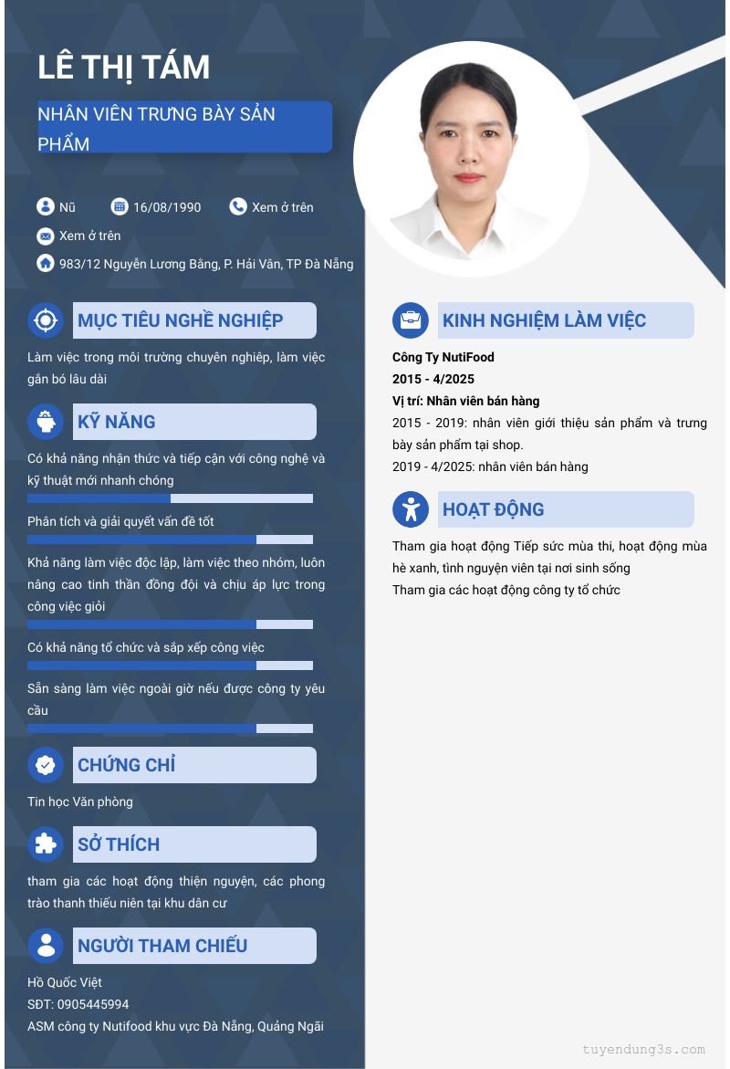 Mở xem thông tin đầy đủ ứng viên Lê Thị Tám chỉ với 2 điểm. Ứng viên được cập nhật ngày 09/10/2025