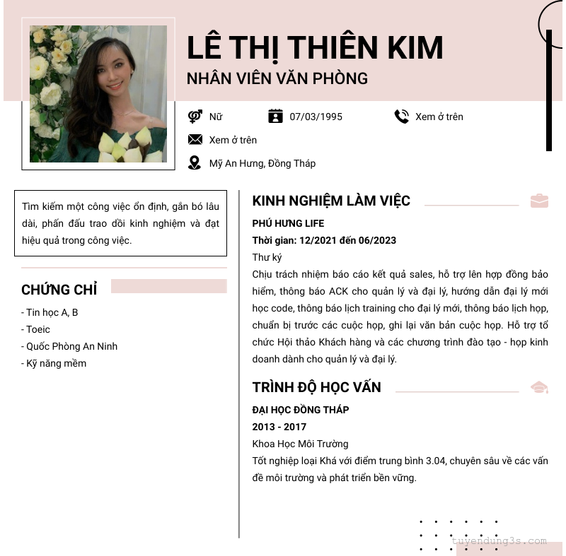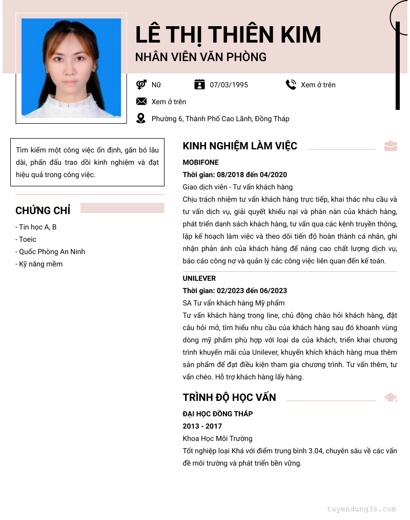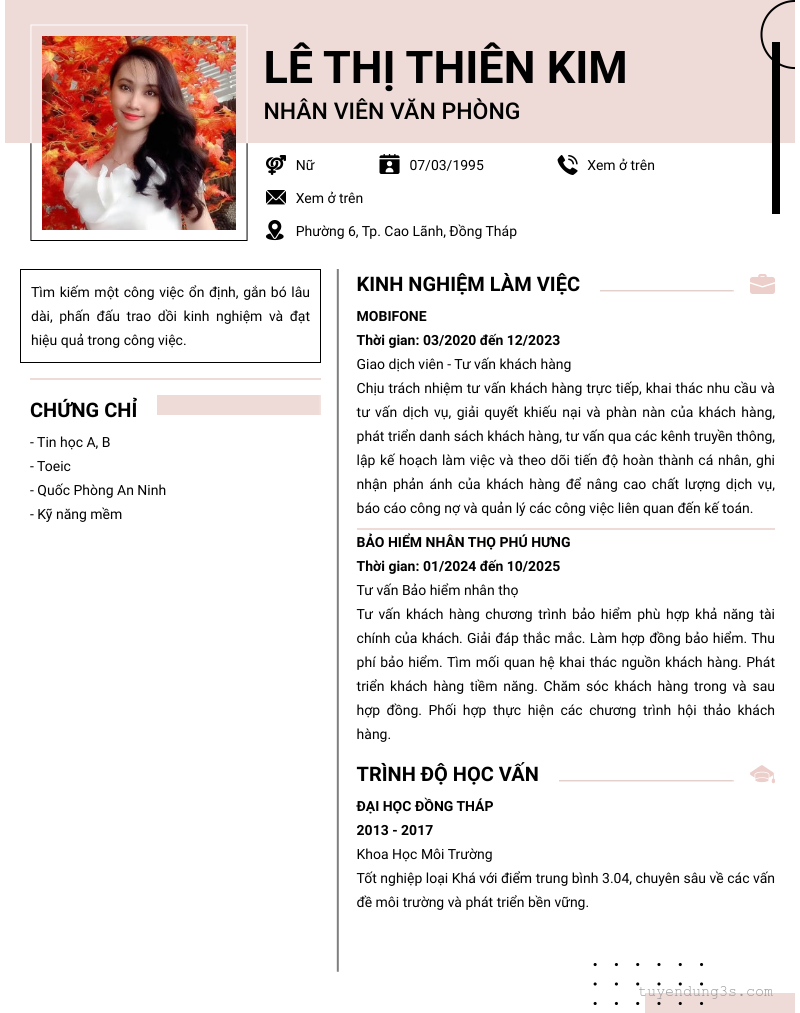 Mở xem thông tin đầy đủ ứng viên Lê Thị Thiên Kim chỉ với 2 điểm. Ứng viên được cập nhật ngày 07/02/2025