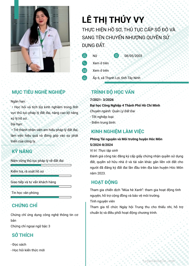 Mở xem thông tin đầy đủ ứng viên Lê Thị Thúy Vy chỉ với 2 điểm. Ứng viên được cập nhật ngày 10/03/2026