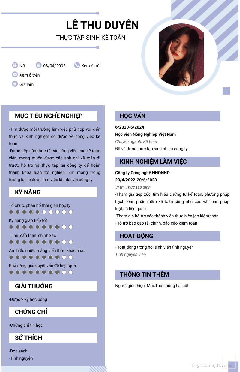 Mở xem thông tin đầy đủ ứng viên LÊ THU DUYÊN chỉ với 2 điểm. Ứng viên được cập nhật ngày 11/01/2024