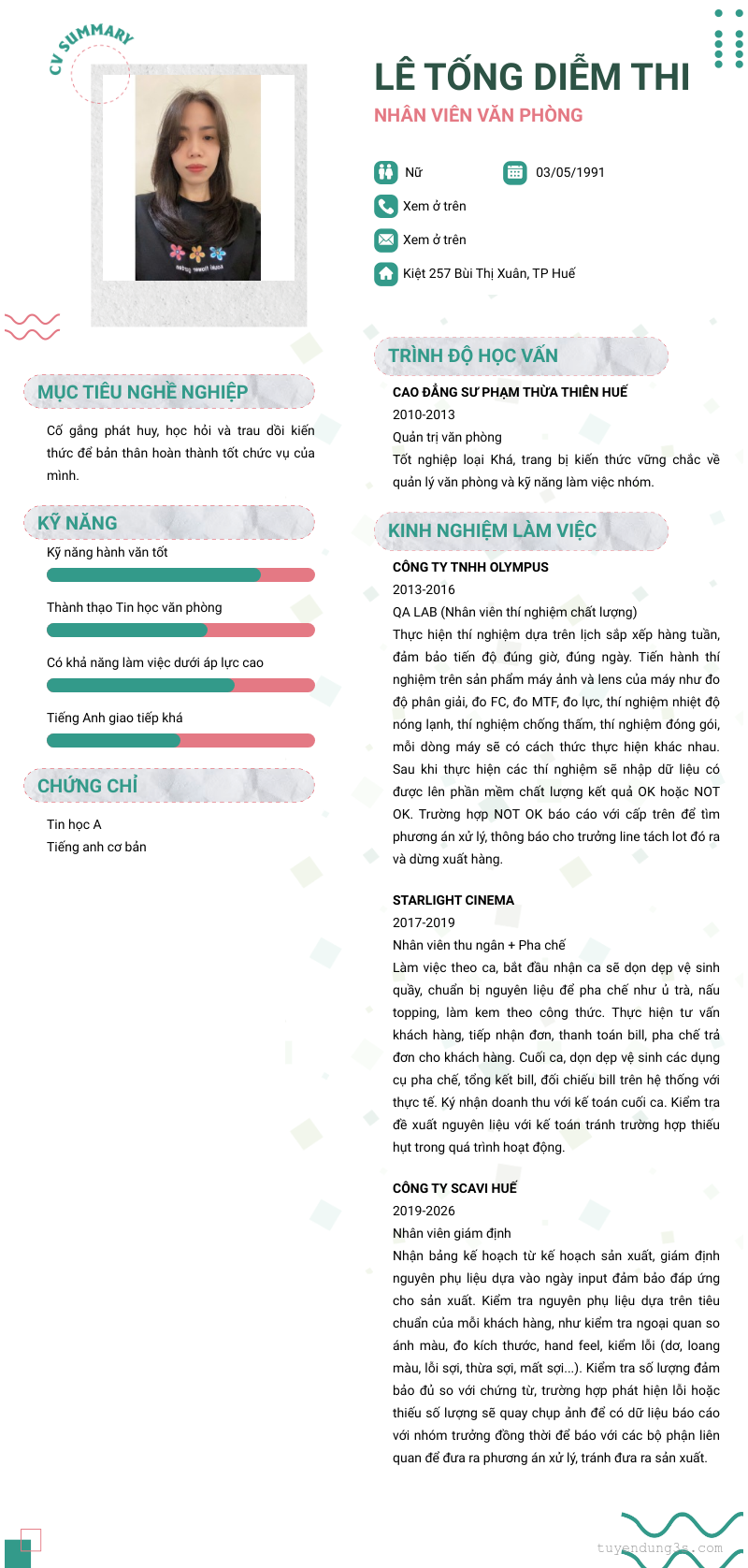 Mở xem thông tin đầy đủ ứng viên Lê Tống Diễm Thi chỉ với 2 điểm. Ứng viên được cập nhật ngày 13/04/2026