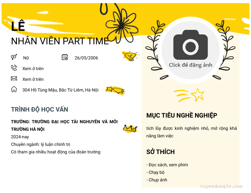 Nơi ở hiện tại: 304 Hồ Tùng Mậu, Bắc Từ Liêm, Hà Nội