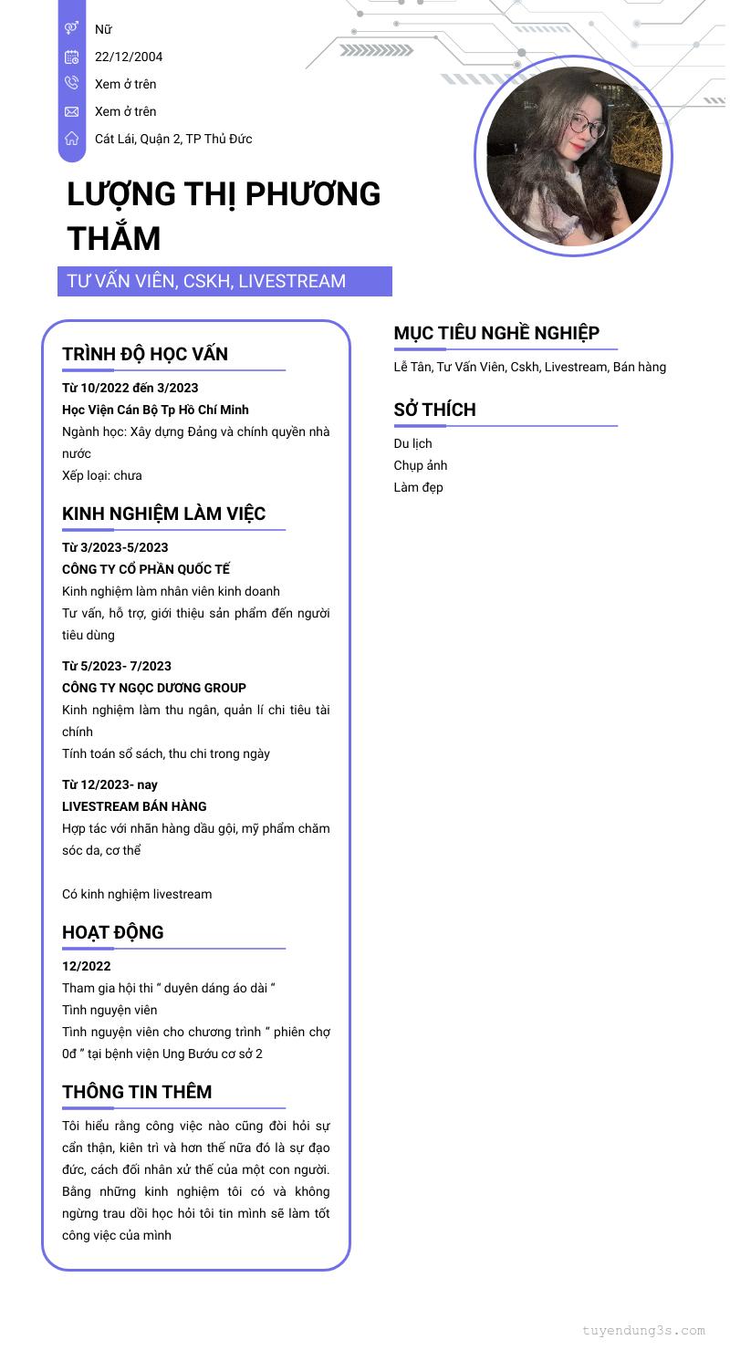 Mở xem thông tin đầy đủ ứng viên Lượng Thị Phương Thắm chỉ với 2 điểm. Ứng viên được cập nhật ngày 16/06/2024