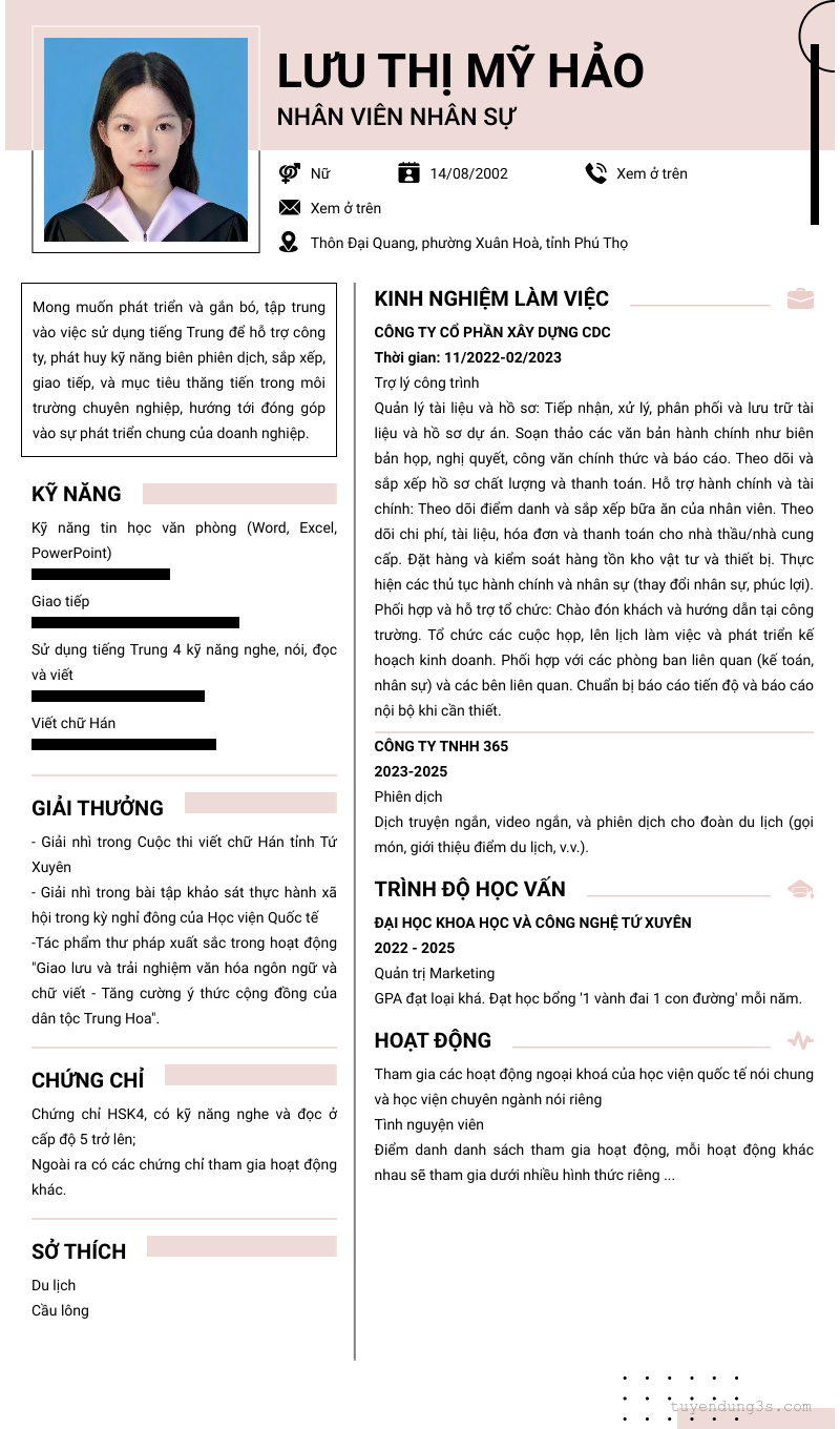 Mở xem thông tin đầy đủ ứng viên LƯU THỊ MỸ HẢO chỉ với 2 điểm. Ứng viên được cập nhật ngày 08/12/2025
