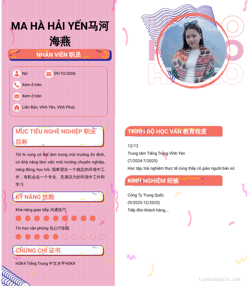 Mở xem thông tin đầy đủ ứng viên Ma Hà Hải Yến马河海燕 chỉ với 2 điểm. Ứng viên được cập nhật ngày 13/03/2026