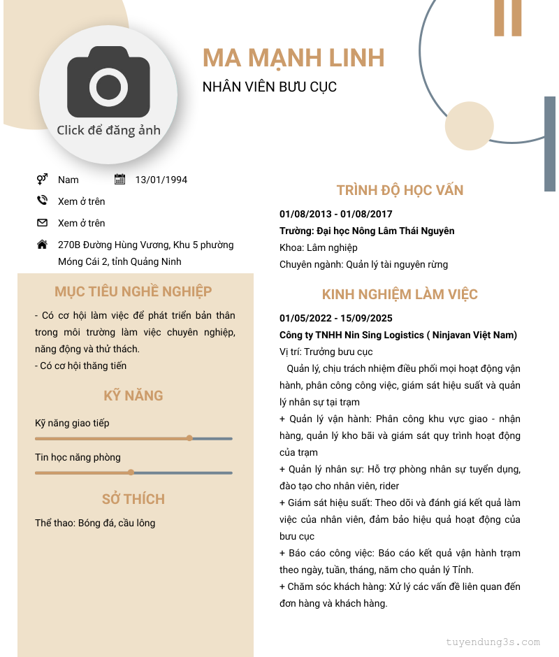 Mở xem thông tin đầy đủ ứng viên MA MẠNH LINH chỉ với 2 điểm. Ứng viên được cập nhật ngày 09/12/2025