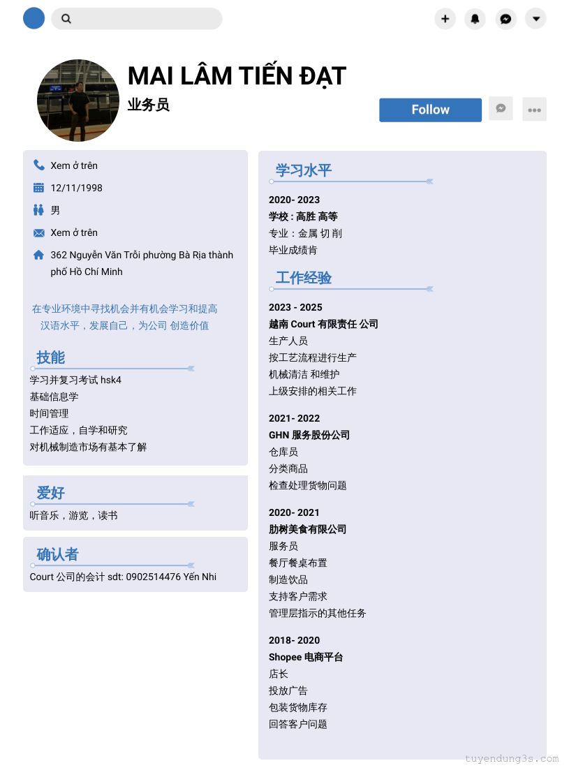 Mở xem thông tin đầy đủ ứng viên Mai Lâm Tiến Đạt chỉ với 2 điểm. Ứng viên được cập nhật ngày 01/10/2025