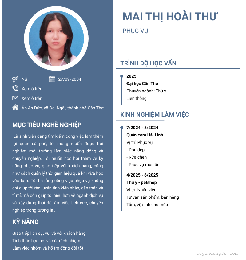 Mở xem thông tin đầy đủ ứng viên Mai Thị Hoài Thư chỉ với 2 điểm. Ứng viên được cập nhật ngày 14/10/2025