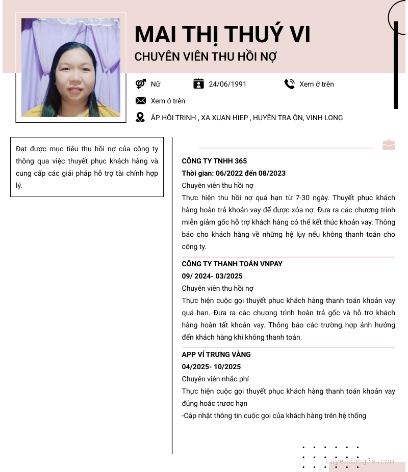 Mở xem thông tin đầy đủ ứng viên Mai Thị Thuý Vi chỉ với 2 điểm. Ứng viên được cập nhật ngày 17/11/2025