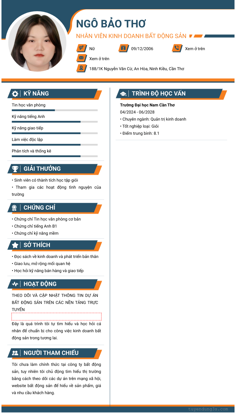 Mở xem thông tin đầy đủ ứng viên NGÔ BẢO THƠ chỉ với 2 điểm. Ứng viên được cập nhật ngày 01/04/2026