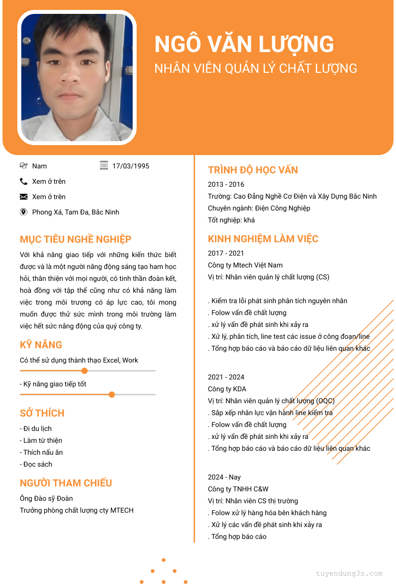 Mở xem thông tin đầy đủ ứng viên NGÔ VĂN LƯỢNG chỉ với 2 điểm. Ứng viên được cập nhật ngày 01/04/2026