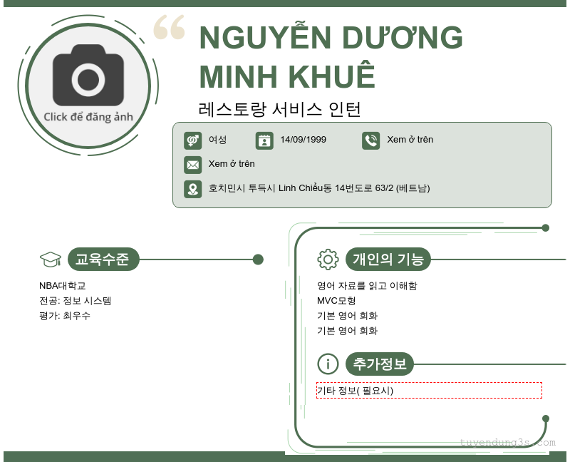 Nơi ở hiện tại: 호치민시 투득시 Linh Chiểu동 14번도로 63/2 (베트남)