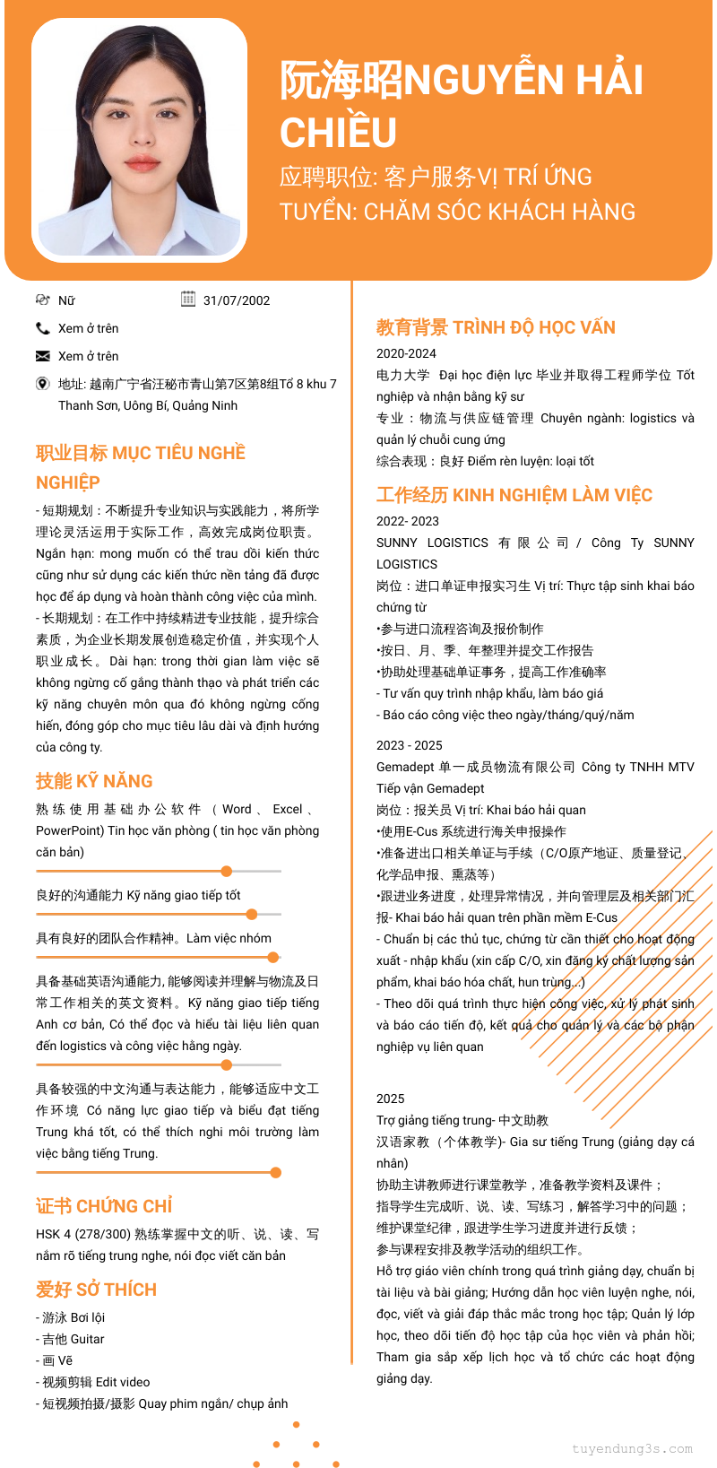 应聘职位: 客户服务Vị trí ứng tuyển: chăm sóc khách hàng