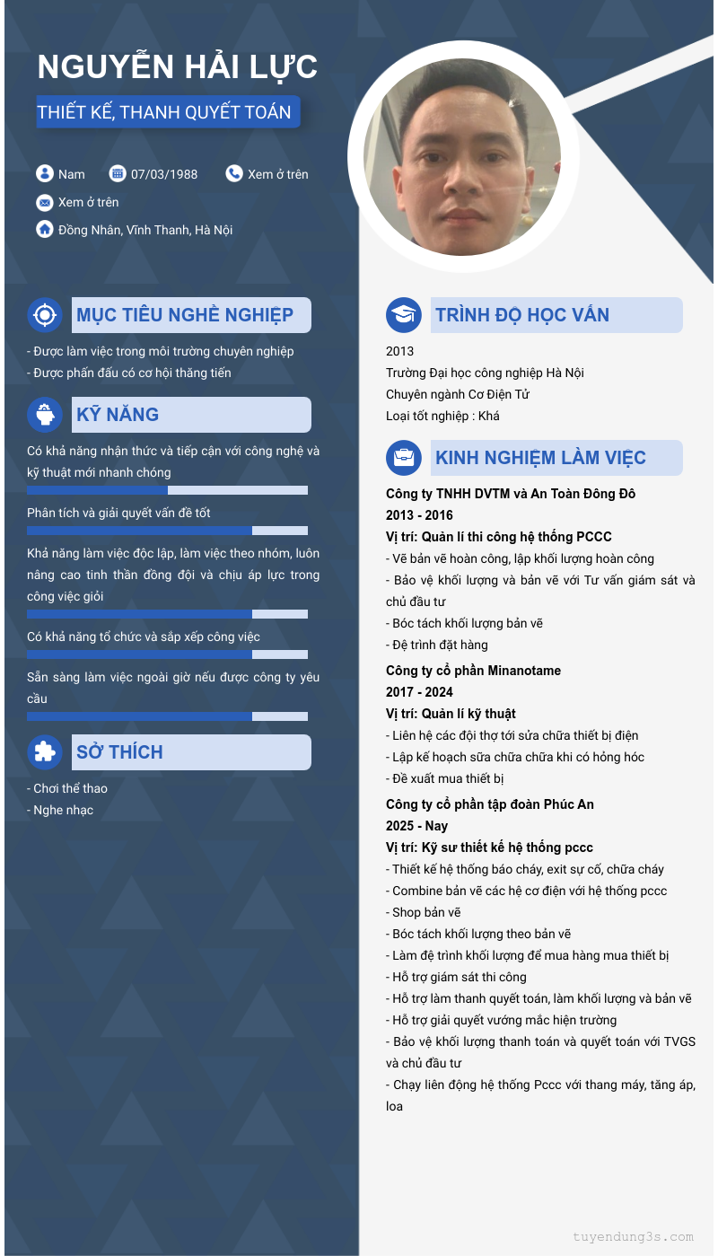 Mở xem thông tin đầy đủ ứng viên NGUYỄN HẢI LỰC chỉ với 2 điểm. Ứng viên được cập nhật ngày 10/12/2025