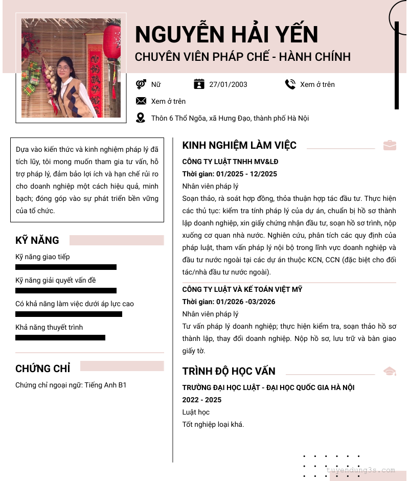 Mở xem thông tin đầy đủ ứng viên Nguyễn Hải Yến chỉ với 2 điểm. Ứng viên được cập nhật ngày 03/04/2026