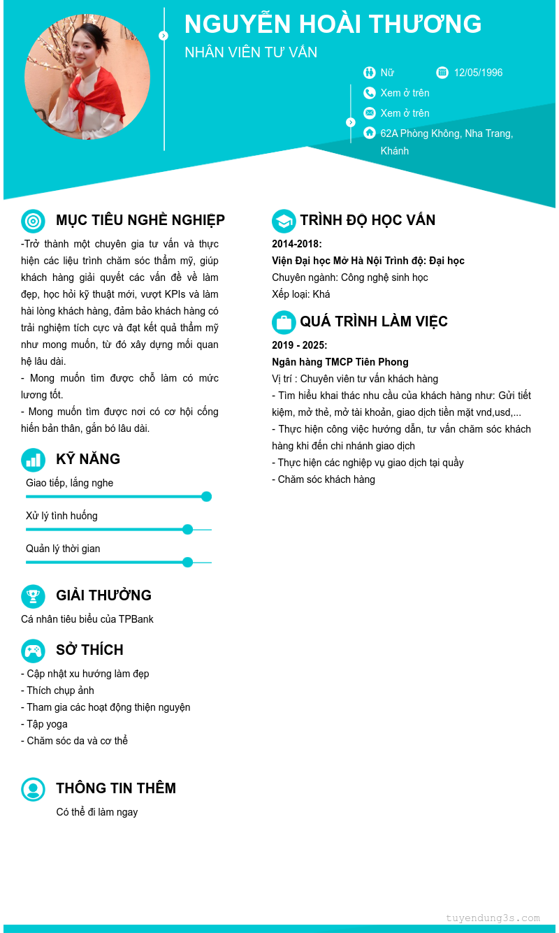 Mở xem thông tin đầy đủ ứng viên NGUYỄN HOÀI THƯƠNG chỉ với 2 điểm. Ứng viên được cập nhật ngày 30/10/2025