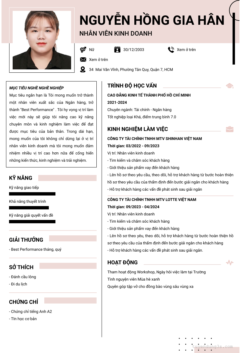Mở xem thông tin đầy đủ ứng viên Nguyễn Hồng Gia Hân chỉ với 2 điểm. Ứng viên được cập nhật ngày 12/06/2024
