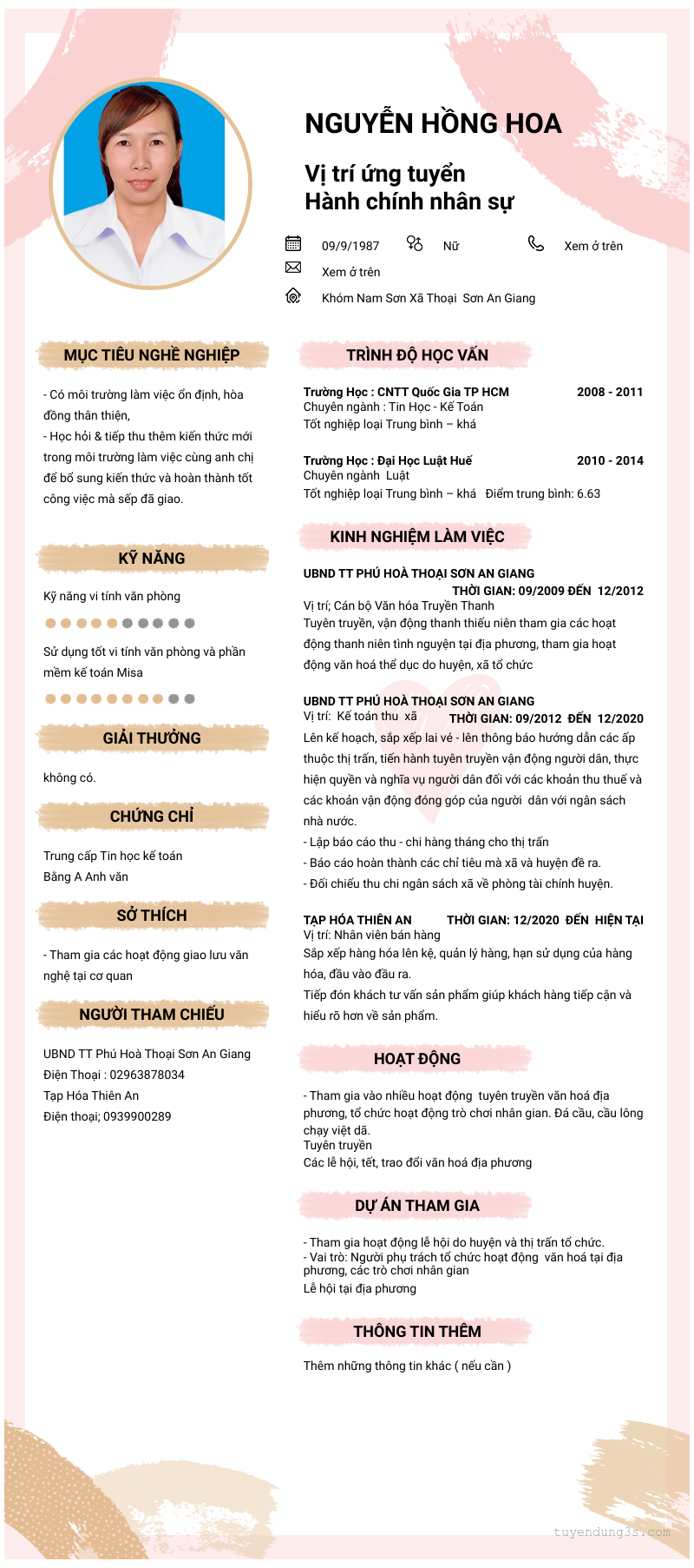 Mở xem thông tin đầy đủ ứng viên Nguyễn Hồng Hoa chỉ với 2 điểm. Ứng viên được cập nhật ngày 09/10/2025