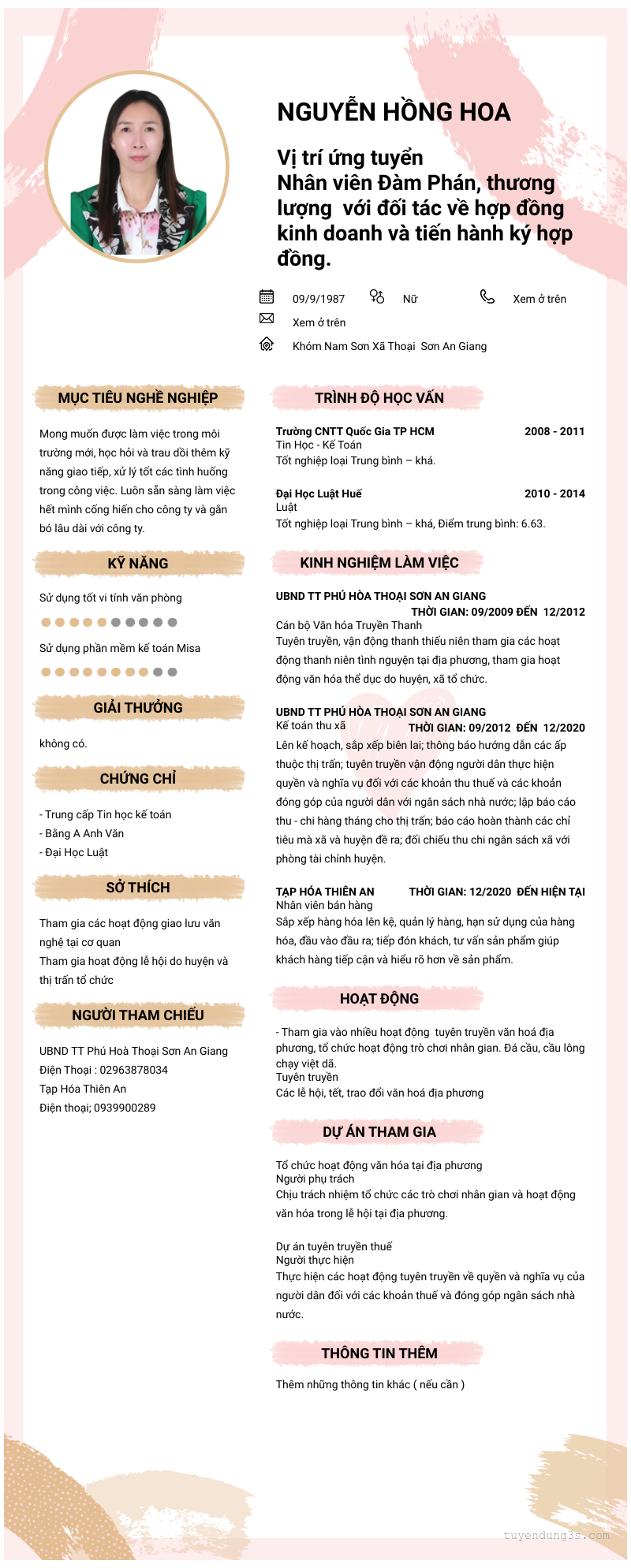 Mở xem thông tin đầy đủ ứng viên Nguyễn Hồng Hoa chỉ với 2 điểm. Ứng viên được cập nhật ngày 12/04/2026