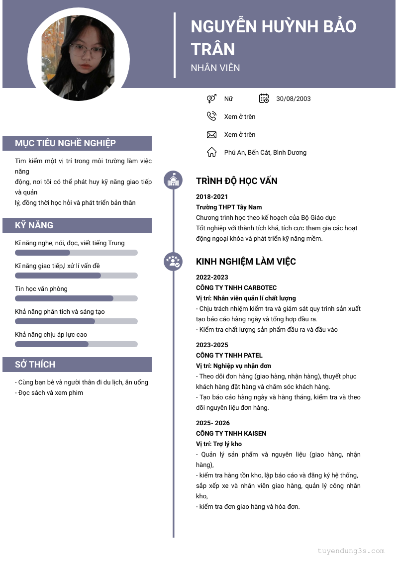 Mở xem thông tin đầy đủ ứng viên Nguyễn Huỳnh Bảo Trân chỉ với 2 điểm. Ứng viên được cập nhật ngày 30/03/2026