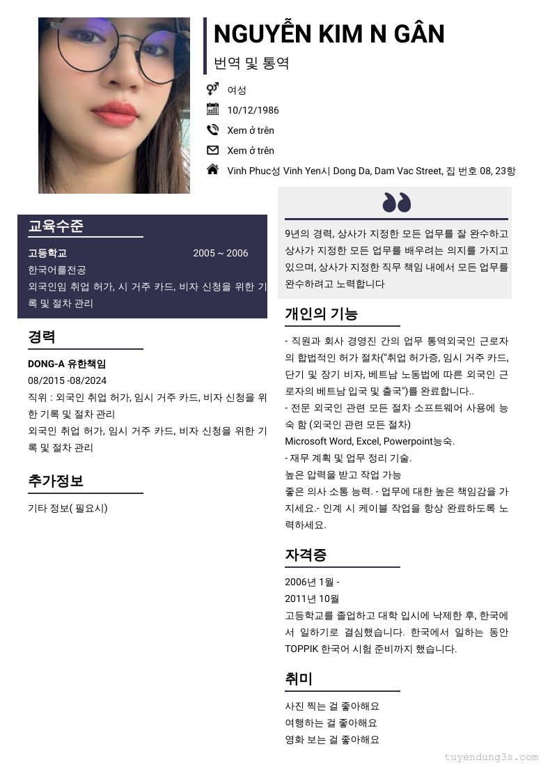 Nơi ở hiện tại: Vinh Phuc성 Vinh Yen시 Dong Da, Dam Vac Street, 집 번호 08, 23항