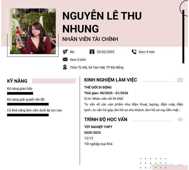 Mở xem thông tin đầy đủ ứng viên Nguyễn Lê Thu Nhung chỉ với 2 điểm. Ứng viên được cập nhật ngày 30/03/2026
