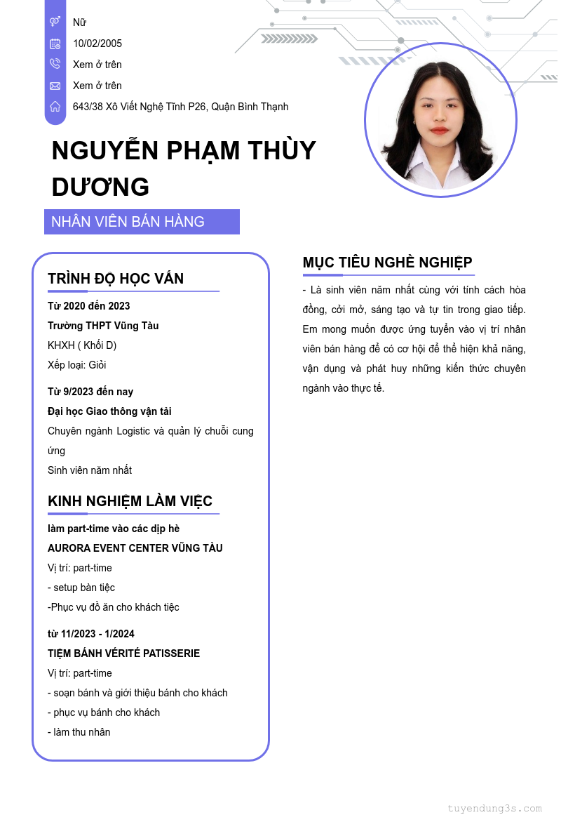 Mở xem thông tin đầy đủ ứng viên NGUYỄN PHẠM THÙY DƯƠNG chỉ với 2 điểm. Ứng viên được cập nhật ngày 01/03/2024