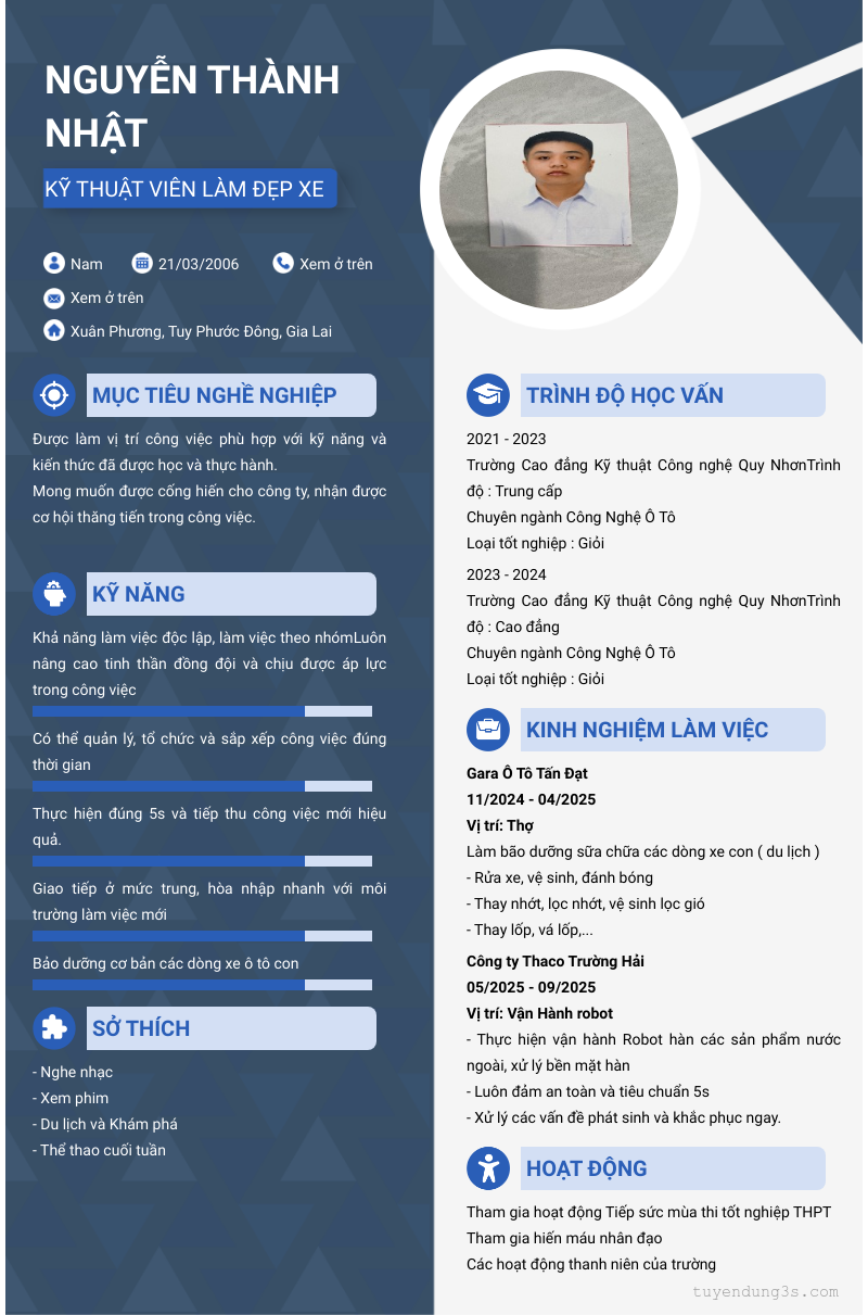 Mở xem thông tin đầy đủ ứng viên Nguyễn Thành Nhật chỉ với 2 điểm. Ứng viên được cập nhật ngày 27/09/2025
