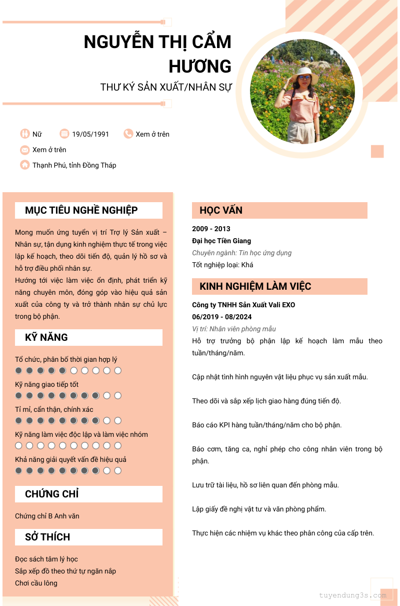 Mở xem thông tin đầy đủ ứng viên NGUYỄN THỊ CẨM HƯƠNG chỉ với 2 điểm. Ứng viên được cập nhật ngày 22/11/2025