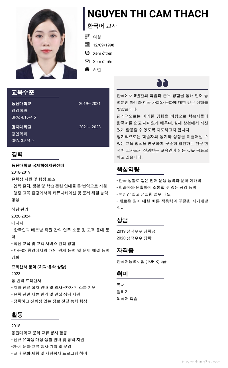 Mở xem thông tin đầy đủ ứng viên NGUYEN THI CAM THACH chỉ với 2 điểm. Ứng viên được cập nhật ngày 27/10/2025