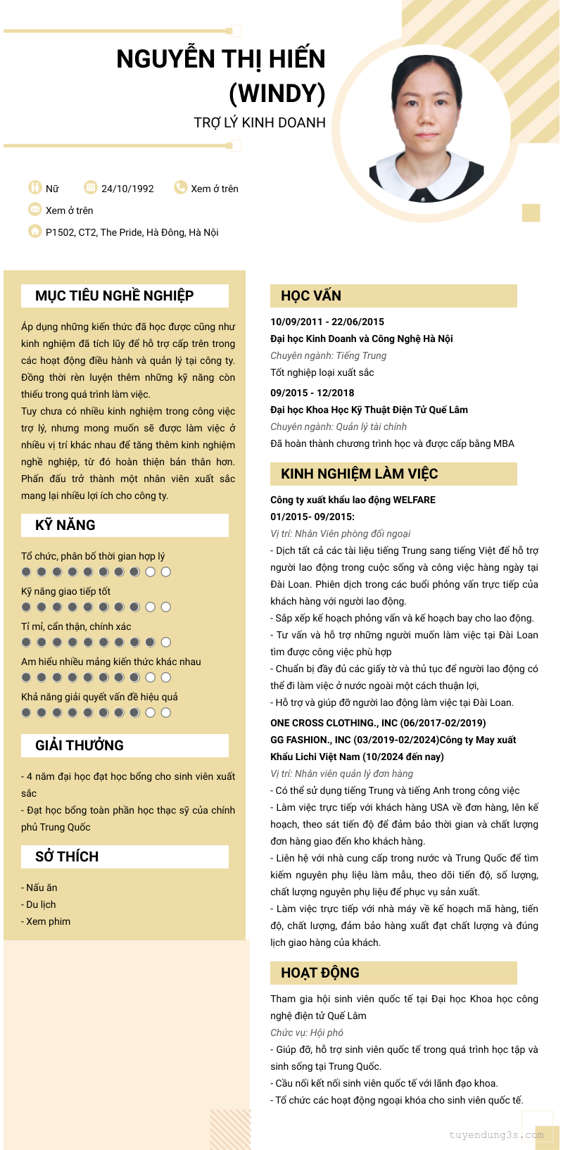 Mở xem thông tin đầy đủ ứng viên NGUYỄN THỊ HIẾN (windy) chỉ với 2 điểm. Ứng viên được cập nhật ngày 09/07/2025