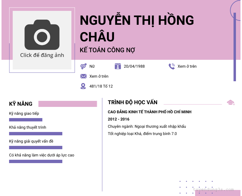 Mở xem thông tin đầy đủ ứng viên NGUYỄN THỊ HồNG CHÂU chỉ với 2 điểm. Ứng viên được cập nhật ngày 22/03/2026