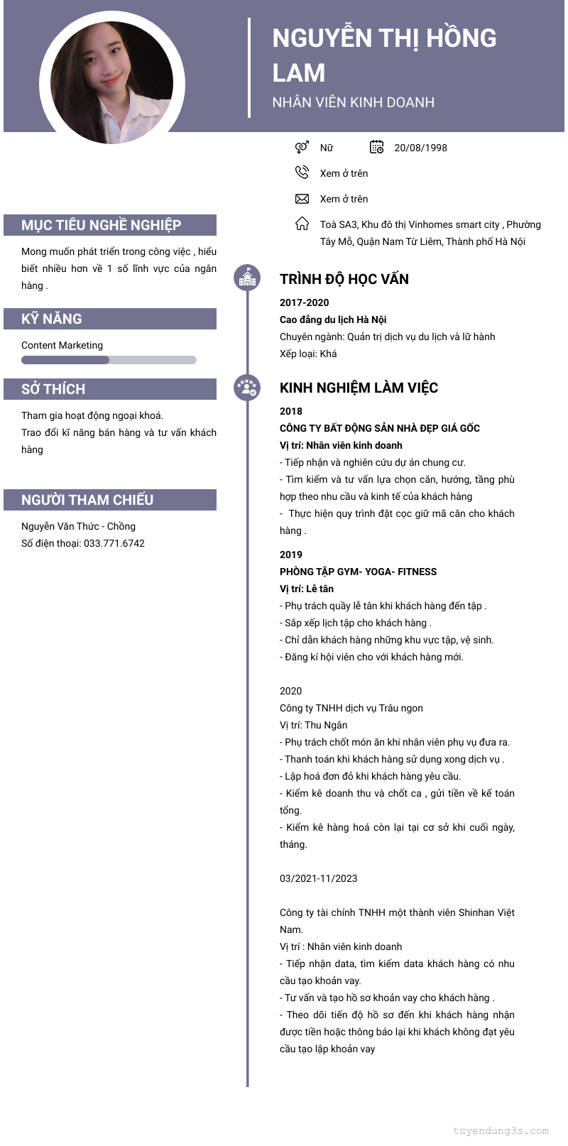 Mở xem thông tin đầy đủ ứng viên Nguyễn Thị Hồng Lam chỉ với 2 điểm. Ứng viên được cập nhật ngày 26/05/2024