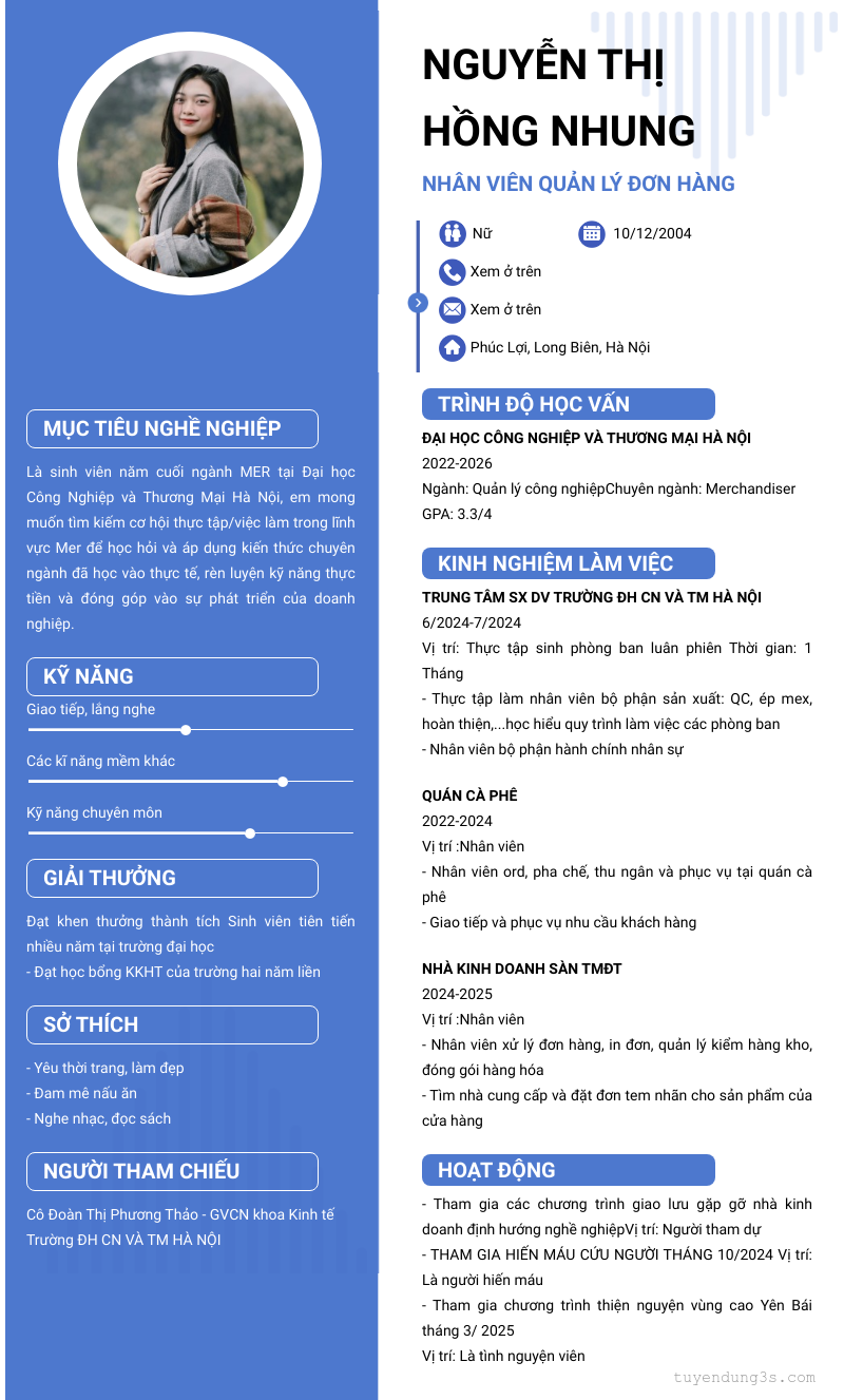 Mở xem thông tin đầy đủ ứng viên NGUYỄN THỊ HỒNG NHUNG chỉ với 2 điểm. Ứng viên được cập nhật ngày 20/09/2025