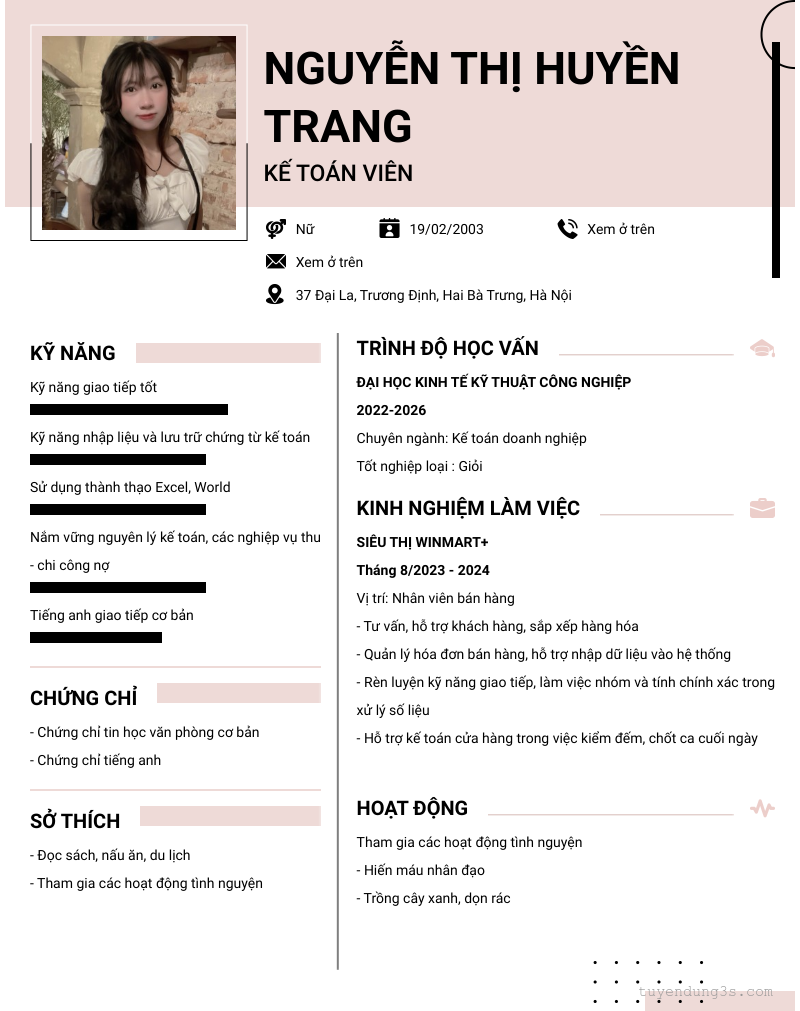 Mở xem thông tin đầy đủ ứng viên NGUYỄN THỊ HUYỀN TRANG chỉ với 2 điểm. Ứng viên được cập nhật ngày 29/10/2025
