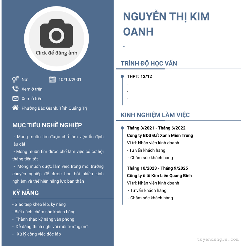 Mở xem thông tin đầy đủ ứng viên NGUYỄN THỊ KIM OANH chỉ với 2 điểm. Ứng viên được cập nhật ngày 08/10/2025