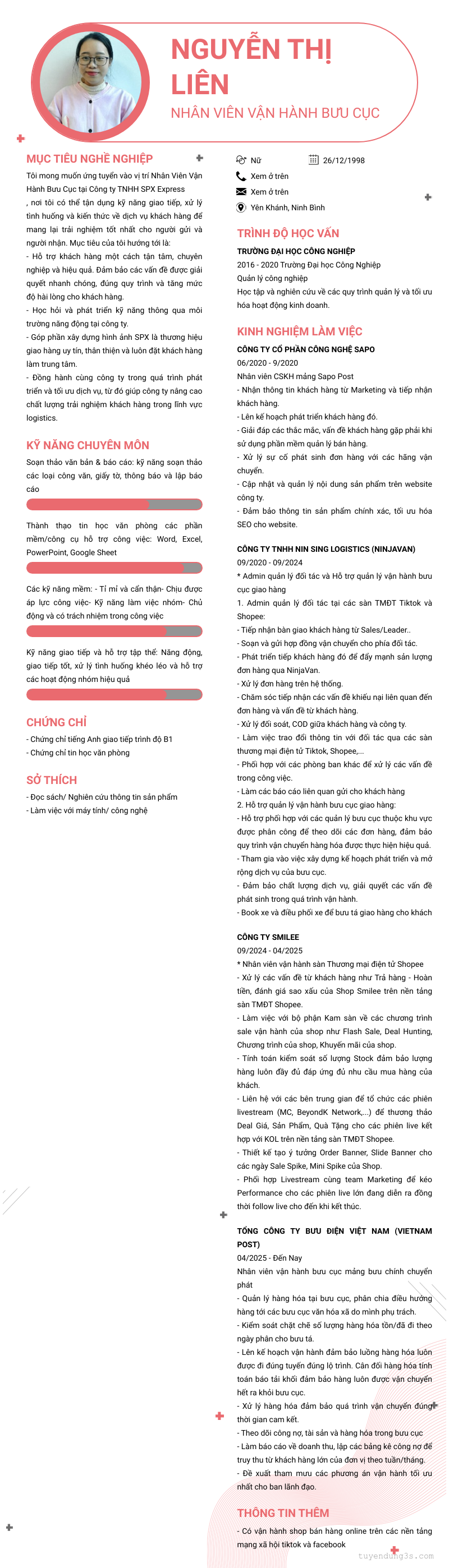 Mở xem thông tin đầy đủ ứng viên NGUYỄN THỊ LIÊN chỉ với 2 điểm. Ứng viên được cập nhật ngày 06/10/2025