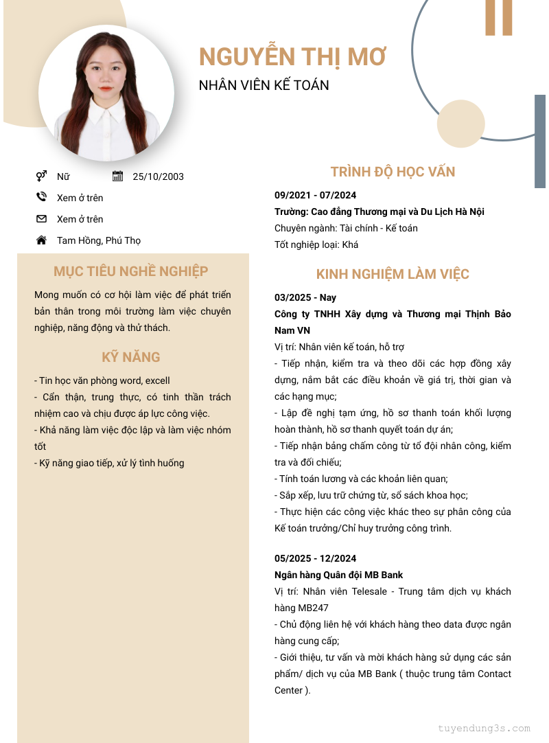 Mở xem thông tin đầy đủ ứng viên Nguyễn Thị Mơ chỉ với 2 điểm. Ứng viên được cập nhật ngày 13/10/2025