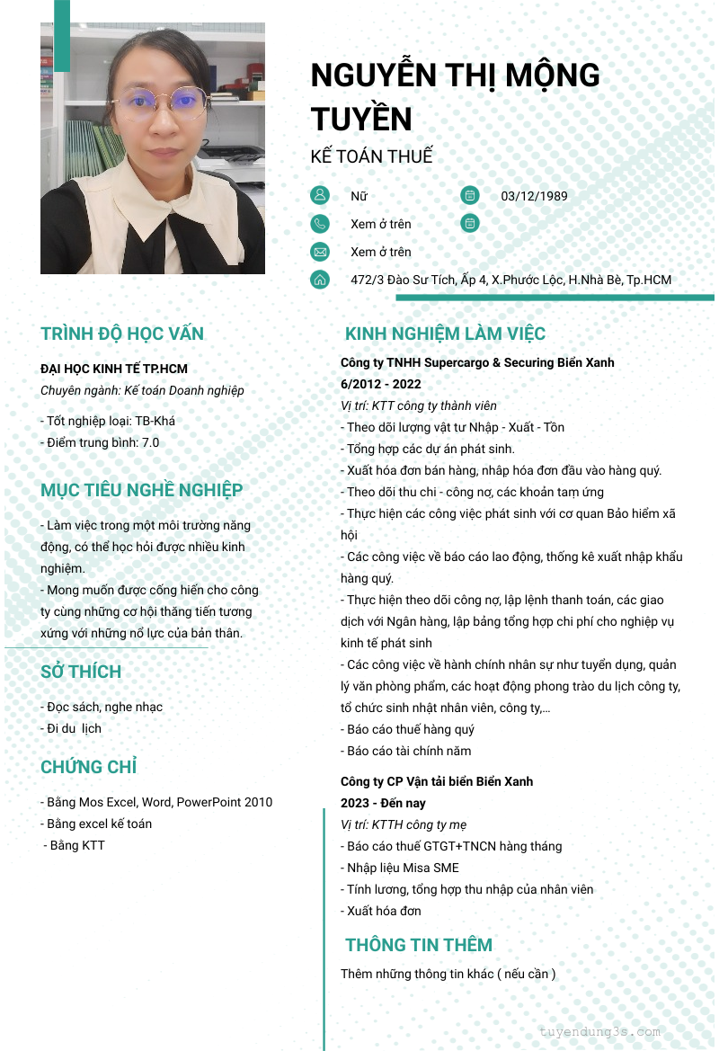 Mở xem thông tin đầy đủ ứng viên NGUYỄN THỊ MỘNG TUYỀN chỉ với 2 điểm. Ứng viên được cập nhật ngày 11/01/2024