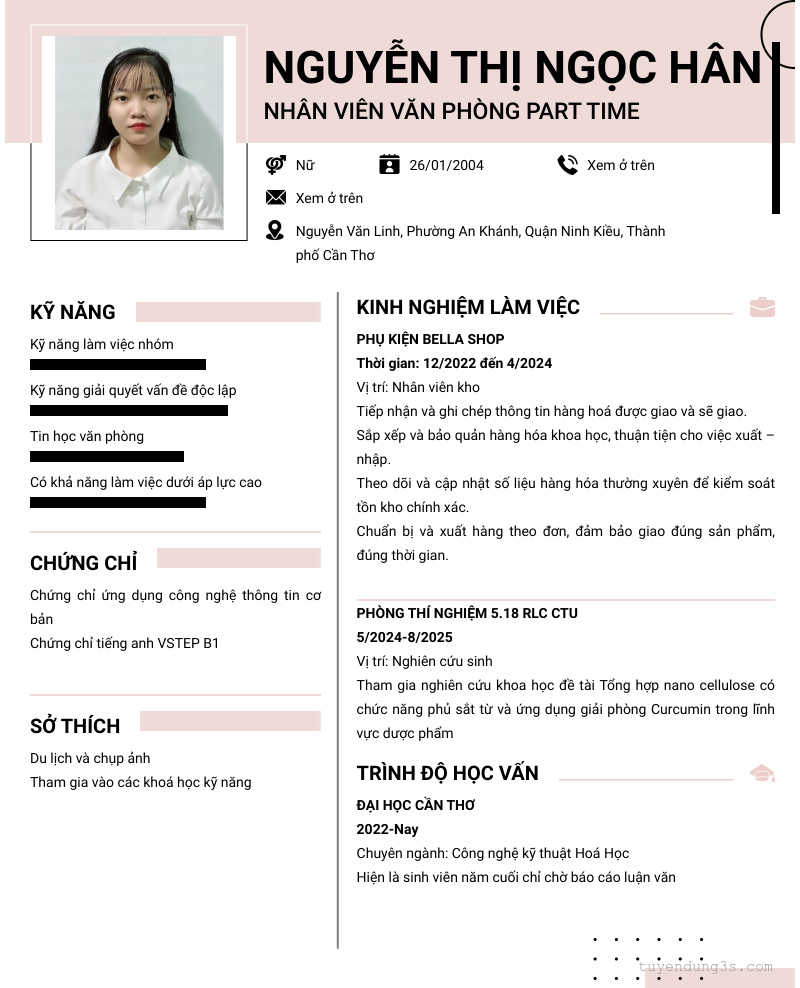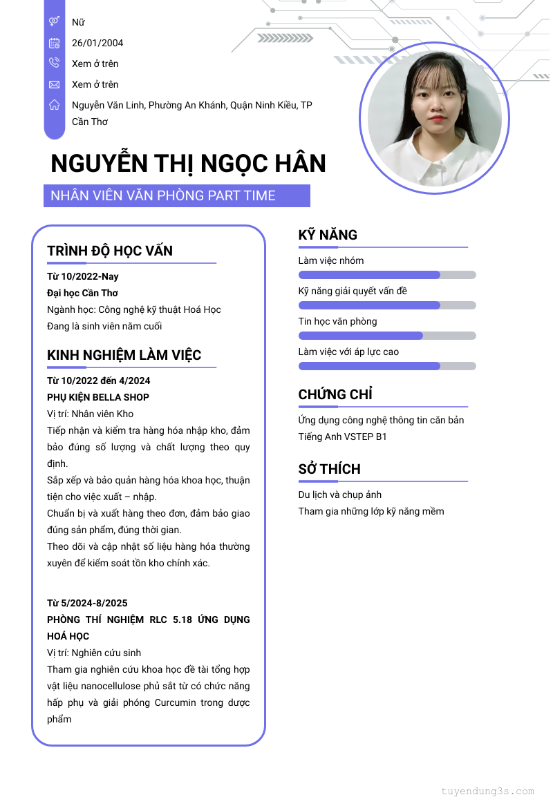 Mở xem thông tin đầy đủ ứng viên Nguyễn Thị Ngọc Hân chỉ với 2 điểm. Ứng viên được cập nhật ngày 08/10/2025