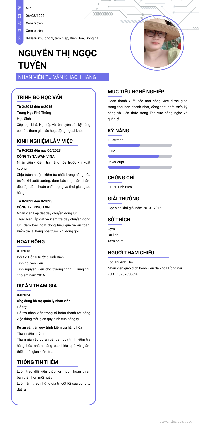 Mở xem thông tin đầy đủ ứng viên Nguyễn Thị Ngọc Tuyền chỉ với 2 điểm. Ứng viên được cập nhật ngày 18/11/2025