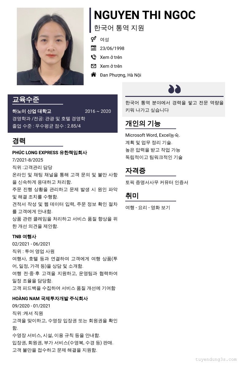 Mở xem thông tin đầy đủ ứng viên Nguyen Thi Ngoc chỉ với 2 điểm. Ứng viên được cập nhật ngày 30/10/2025